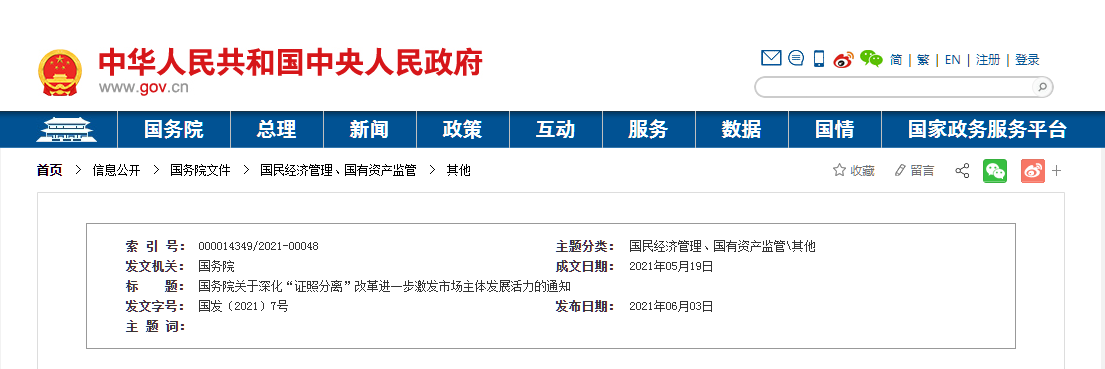 國(guó)務(wù)院關(guān)于深化“證照分離”改革 進(jìn)一步激發(fā)市場(chǎng)主體發(fā)展活力的通知