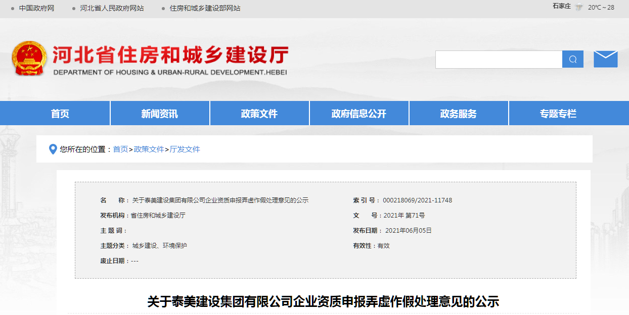 經(jīng)查,泰美建設(shè)集團(tuán)有限公司在資質(zhì)申報(bào)過程中存在個人業(yè)績材料弄虛作假行為?,F(xiàn)將處理意見公示如下: