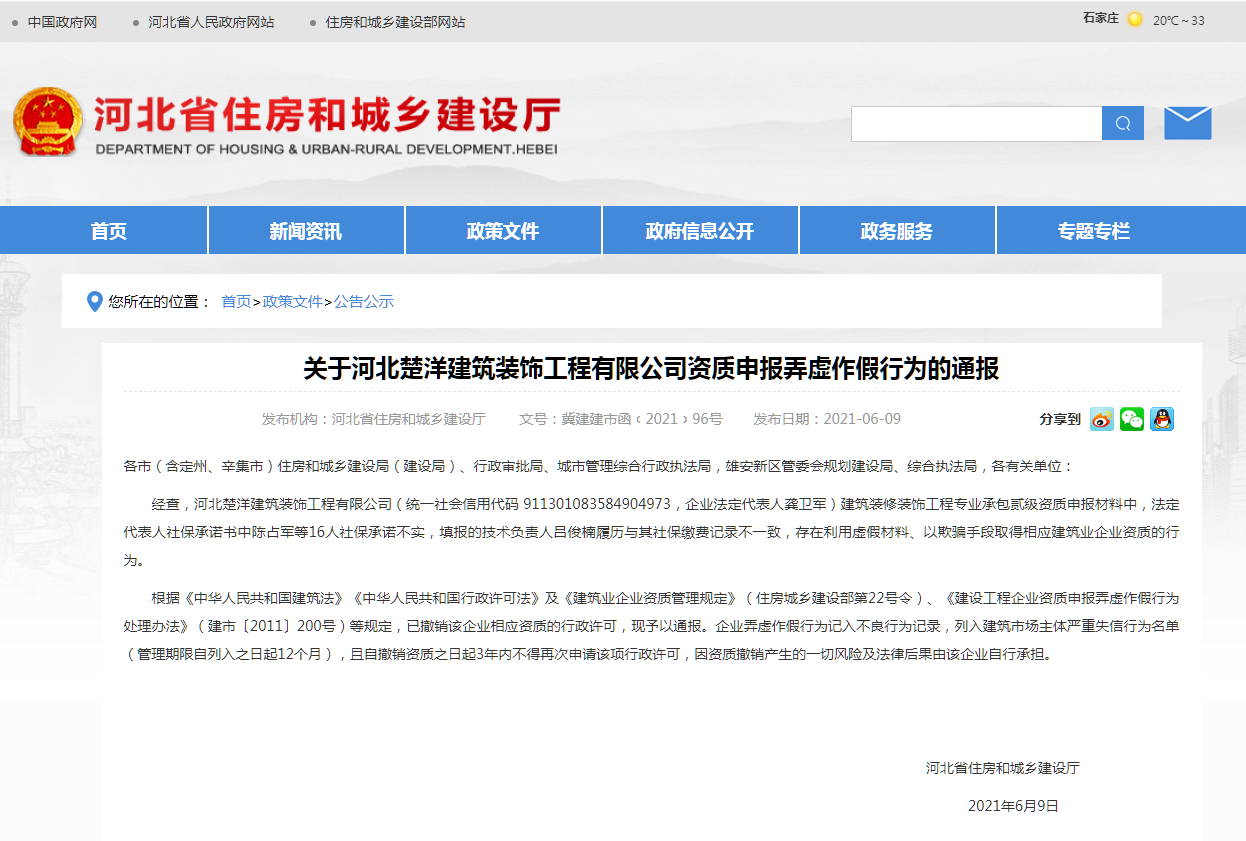 2021年6月9日,河北省住房和城鄉(xiāng)建設廳發(fā)布《關于河北楚洋建筑裝飾工程有限公司資質申報弄虛作假行為的通報》