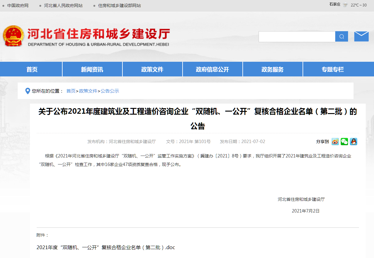 關(guān)于公布2021年度建筑業(yè)及工程造價咨詢企業(yè)“雙隨機、一公開”復核合格企業(yè)名單(第二批)的公告