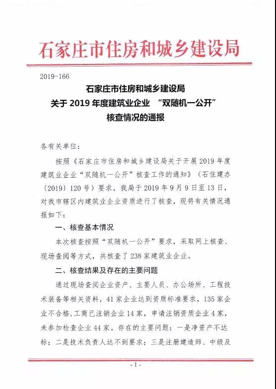 本次共核查了238家建筑業(yè)企業(yè),其中,41家達(dá)到資質(zhì)標(biāo)準(zhǔn)要求,197家不合格(含工商已注銷企業(yè)14家,申請注銷資質(zhì)企業(yè)4家,未參加檢查企業(yè)44家)。
