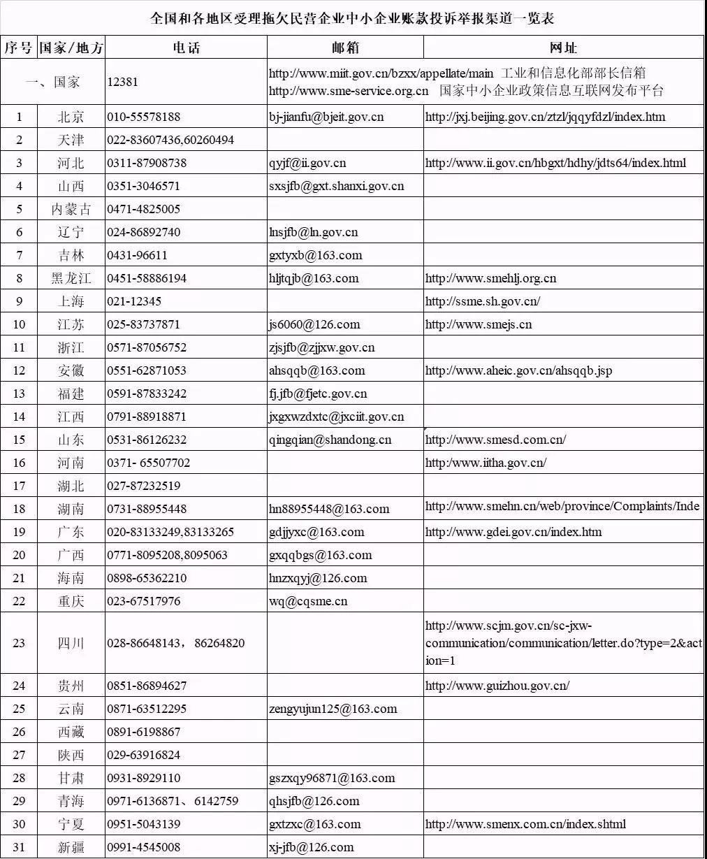 拖欠民營企業(yè)、中小企業(yè)賬款的投訴舉報(bào)渠道見下表??赏ㄟ^電話、郵箱舉報(bào),或打開相應(yīng)網(wǎng)站進(jìn)行在線投訴。