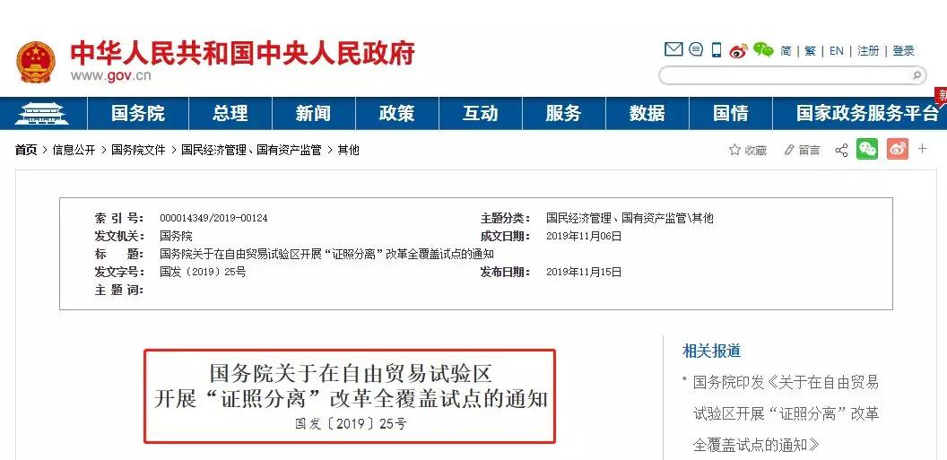 文件名稱:國務(wù)院關(guān)于在自由貿(mào)易試驗區(qū)開展“證照分離”改全覆蓋試點的通知(國發(fā)〔2019〕25號);